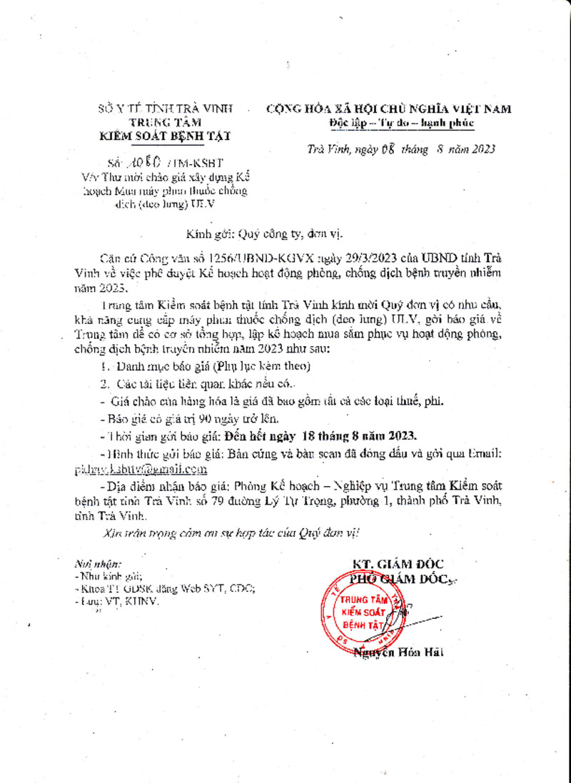 | Tiêu đề văn bản | THƯ MỜI CHÀO GIÁ XÂY DỰNG KẾ HOẠCH MUA MÁY PHUN THUỐC CHÔNG DỊCH (ĐEO LƯNG) ULV. (Lần 2) | ||